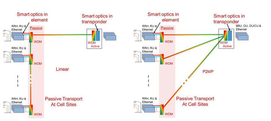 An optimal deployment technology to resolve this challenge is open semi-active transport using smart, self-tuning optics. A semi-active transport approach offers a passive aggregator for fiber relief at the small cell site using self-tuning optics installed directly into the radio or access device. The passive aggregator at the small cell site requires no power, has a small footprint, and uses its own outside plant enclosure along with self-tuning optics, offering a simple, quick and automated turn-up. The active end of this transport has the intelligence to remotely access the small cell site for performance monitoring and diagnostic data via the service channel within the smart optics. Automated turn-up is also achieved at the active site using self-tuning optics. The combination of a semi-active smart transport system for small cells results in fast deployment and remote visibility for proactive maintenance and high service availability. Use of this innovative transport system will help enable mobile network operators to win the race to deliver 5G services, requiring improved coverage and capacity while reducing operating expenses. Below are linear and point-to-multi-point topologies using the semi-active smart transport system.
