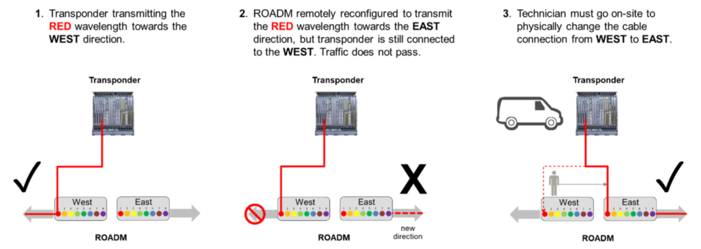 The directionless capability is typically combined with colorless ports as well in order to eliminate site visits for any type of reconfiguration.