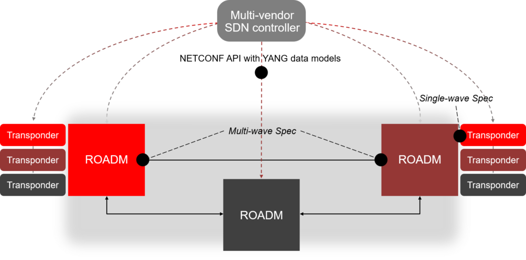 The Open ROADM MSA also defines its own YANG data models to represent both the ROADM and the transponders. The multi-vendor SDN controller manages these network elements using the standard NETCONF protocol. This data model and management API performs a similar function to the T-API and OpenConfig components discussed in my previous blog.