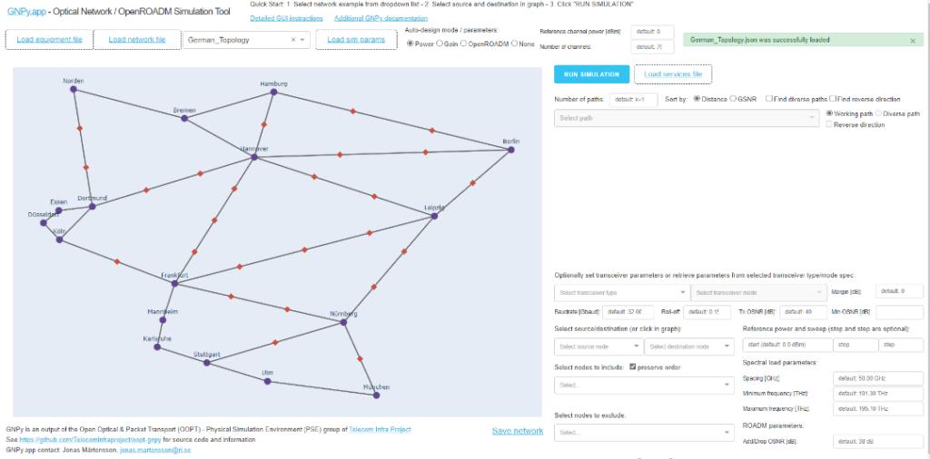 This, at first, might seem like a major shortcoming of GNPy. Can I trust the result if the tool ignores the additional penalty caused by the ROADM and amplifiers? In all fairness, most of the non-linear signal degradation in an optical network is caused by the fiber and a simple approach is to estimate a fixed penalty for the equipment. This additional margin eliminates the need for detailed equipment specifications, though at the cost of producing perfectly optimized designs.