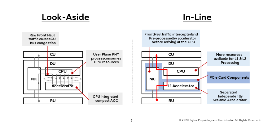 - Inline Layer 1 accelerators: In contrast, inline architectures intercept Layer 1 processing for user plane data before it reaches the CPU. Inline Layer 1 accelerator cards can efficiently handle almost all Layer 1 processing tasks, freeing up CPU resources for Layer 2 and Layer 3 processing.